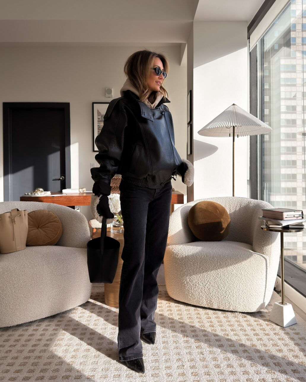 I paired them with this sports bra because I’ve been loving how it helps with my posture lately; it’s honestly become a go-to. On top, I threw on a neutral hoodie and layered this leather jacket we love over it. It adds such a fun, edgy touch, and the leather and quality are top-notch for the price.