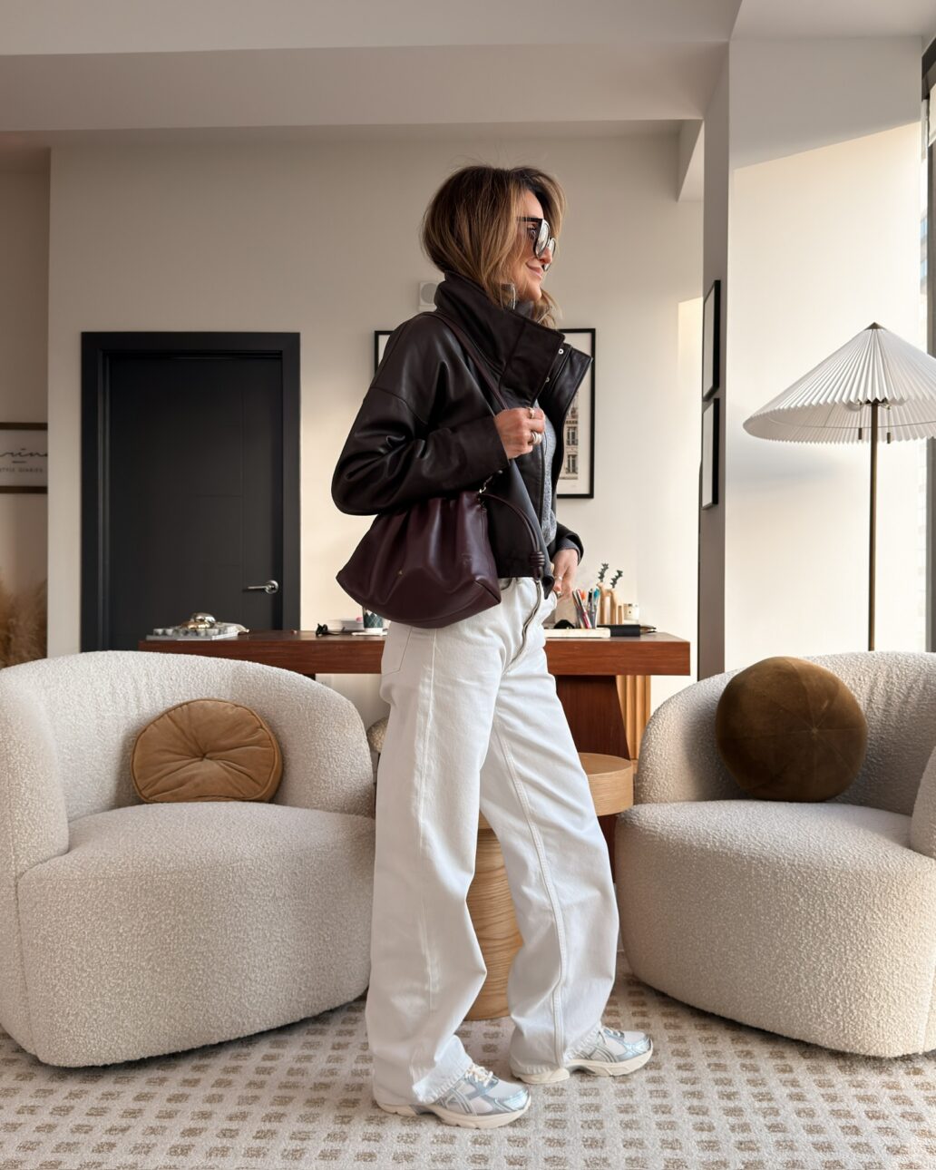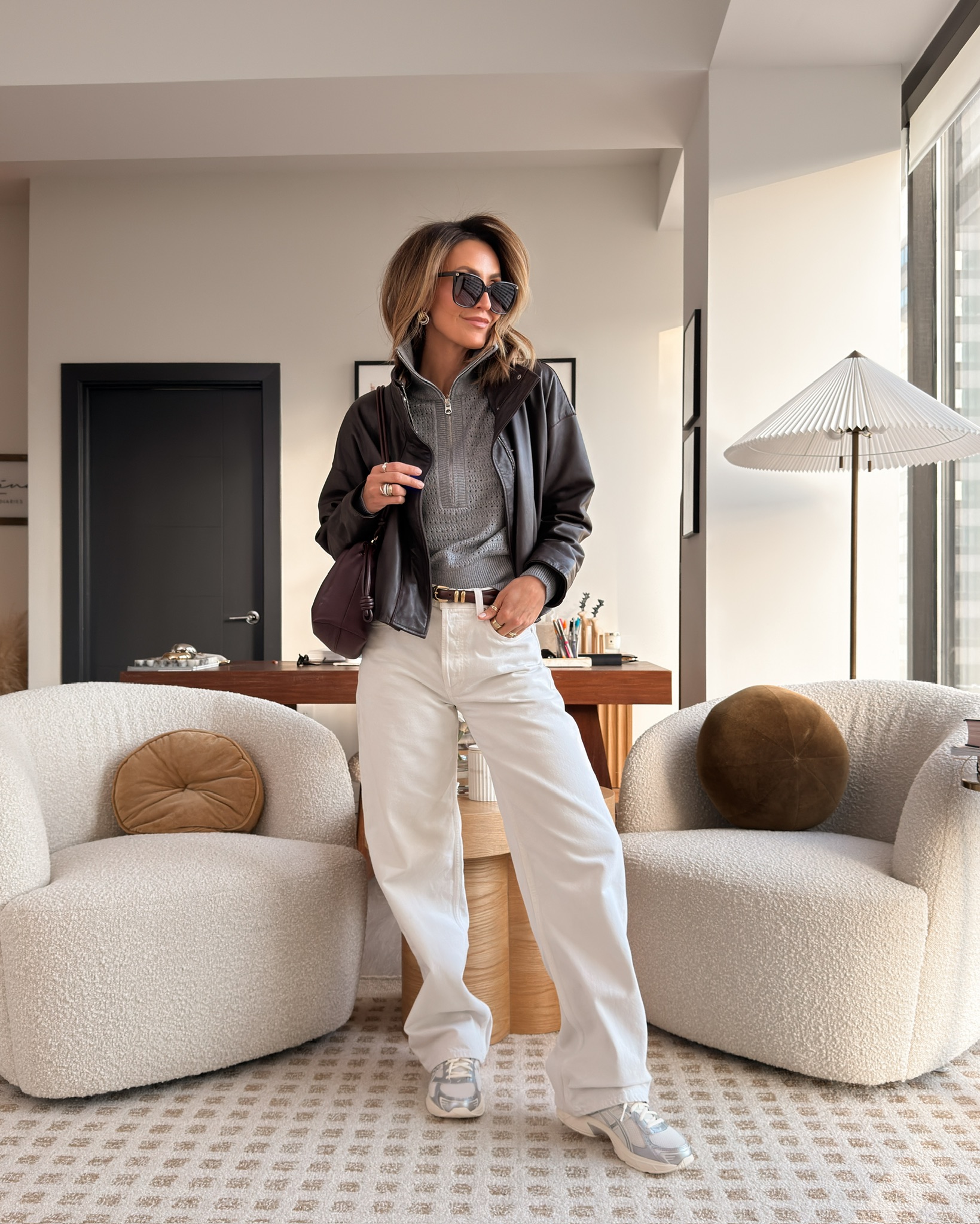 I leaned into grey and burgundy tones here with a cozy grey sweater, and you guys… this leather jacket is SO soft. The deeper chocolate brown color makes it feel rich without being too heavy.