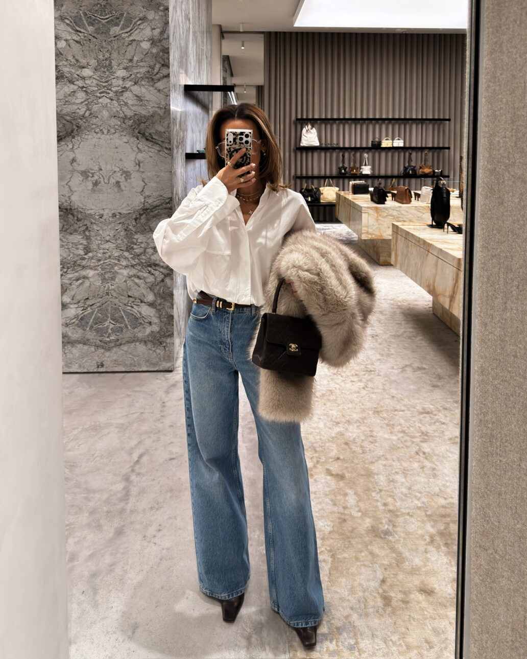 I paired them with a super cute, delicate sweater and topped everything off with a fur coat to keep things cozy. This is one of those jeans looks that feels comfortable but is still elevated.