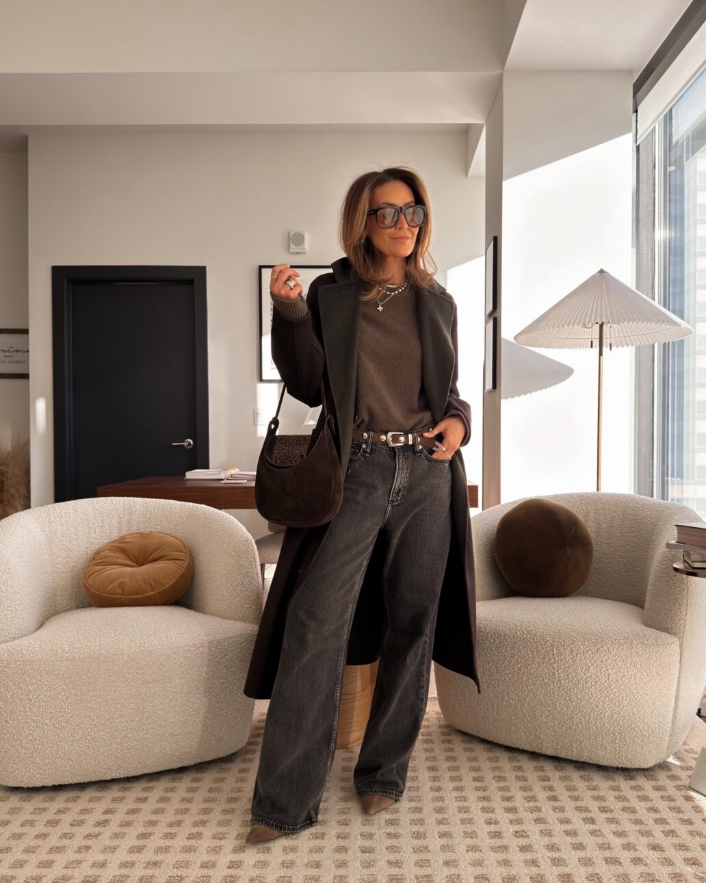 I added an oversized trench slash rain coat, which is what I’m calling the “cool girl jacket”. I loved keeping everything in lighter brown hues for this look; it felt soft, neutral, and really wearable. This is a great example of a casual-chic jeans outfit that works for errands or meetings alike.